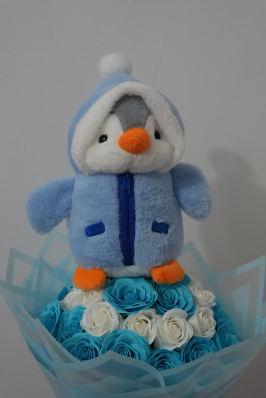 Buchet Pinguin Premium – 31 Trandafiri Alb & Baby Blue