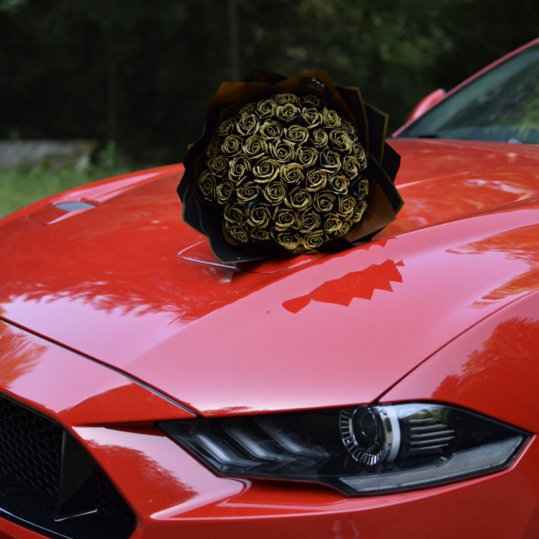 Acest buchet este format din trandafiri premium din săpun, care sunt suflați cu un strat de sclipici special auriu (fixat, pentru a nu se împrăștia sau cădea de pe flori); astfel se creează un efect asemănator trandafirilor criogenați.