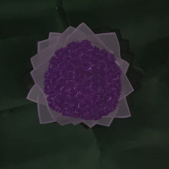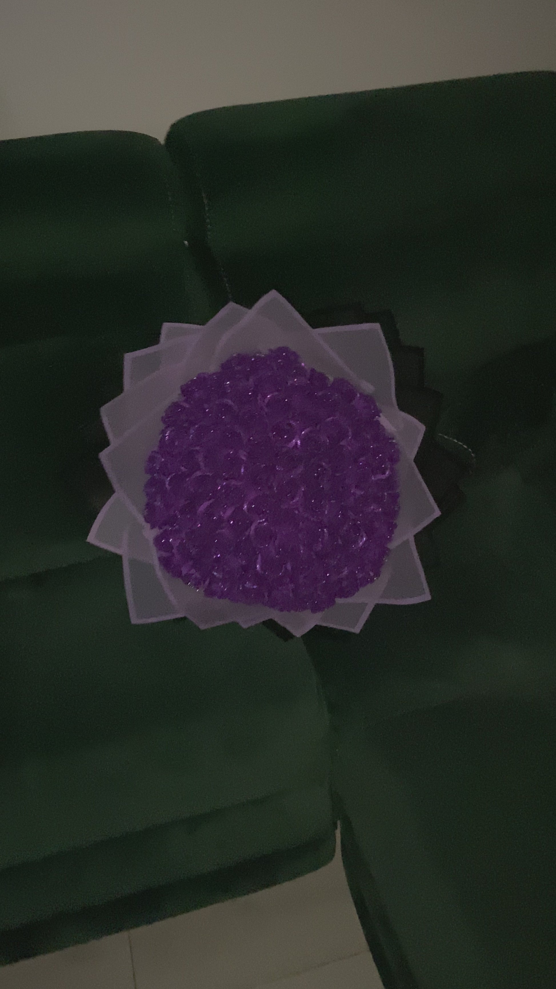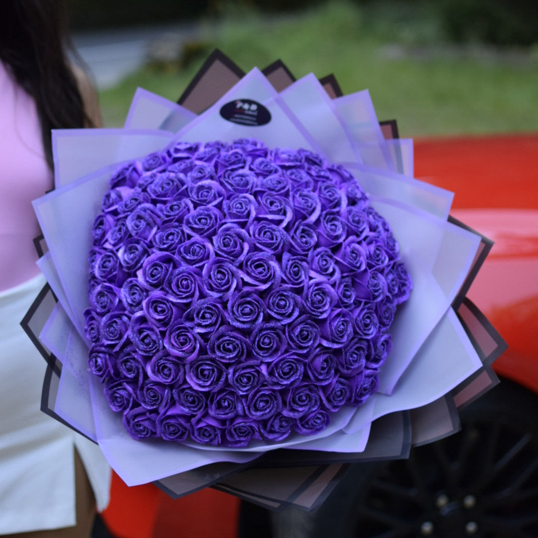 Acest buchet este format din trandafiri premium din săpun, care sunt suflați cu un strat de sclipici special mov (fixat, pentru a nu se împrăștia sau cădea de pe flori); astfel se creează un efect asemănator trandafirilor criogenați.
