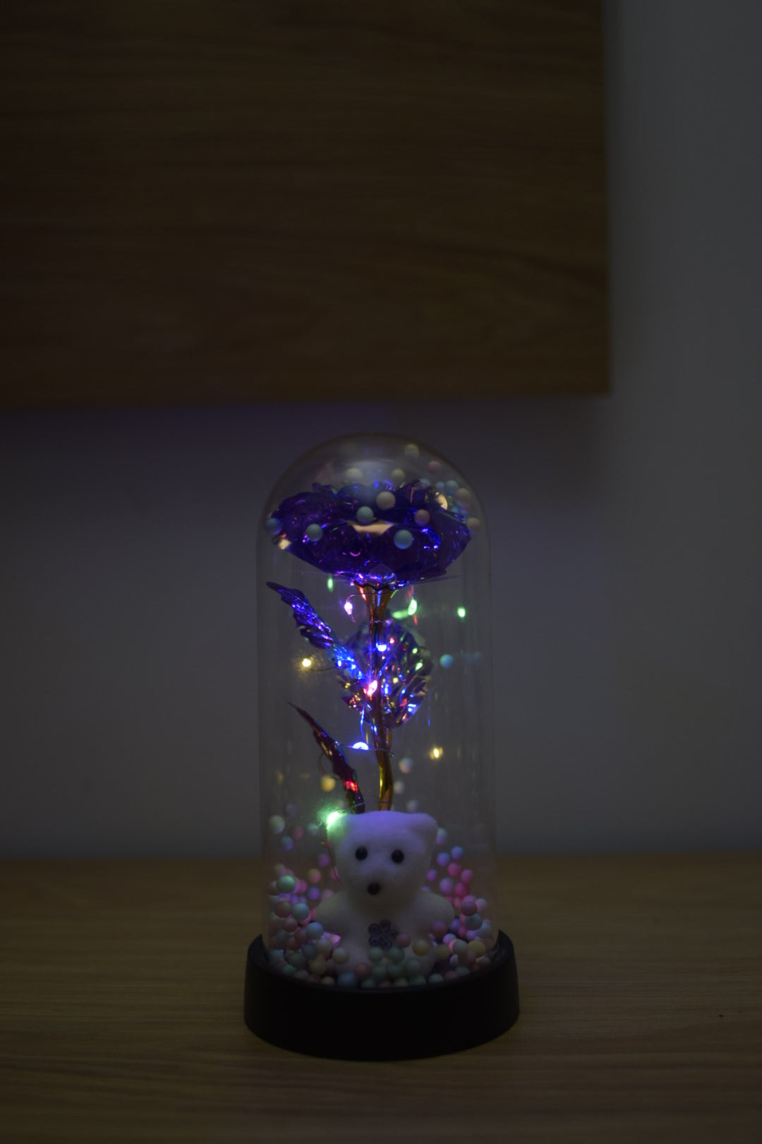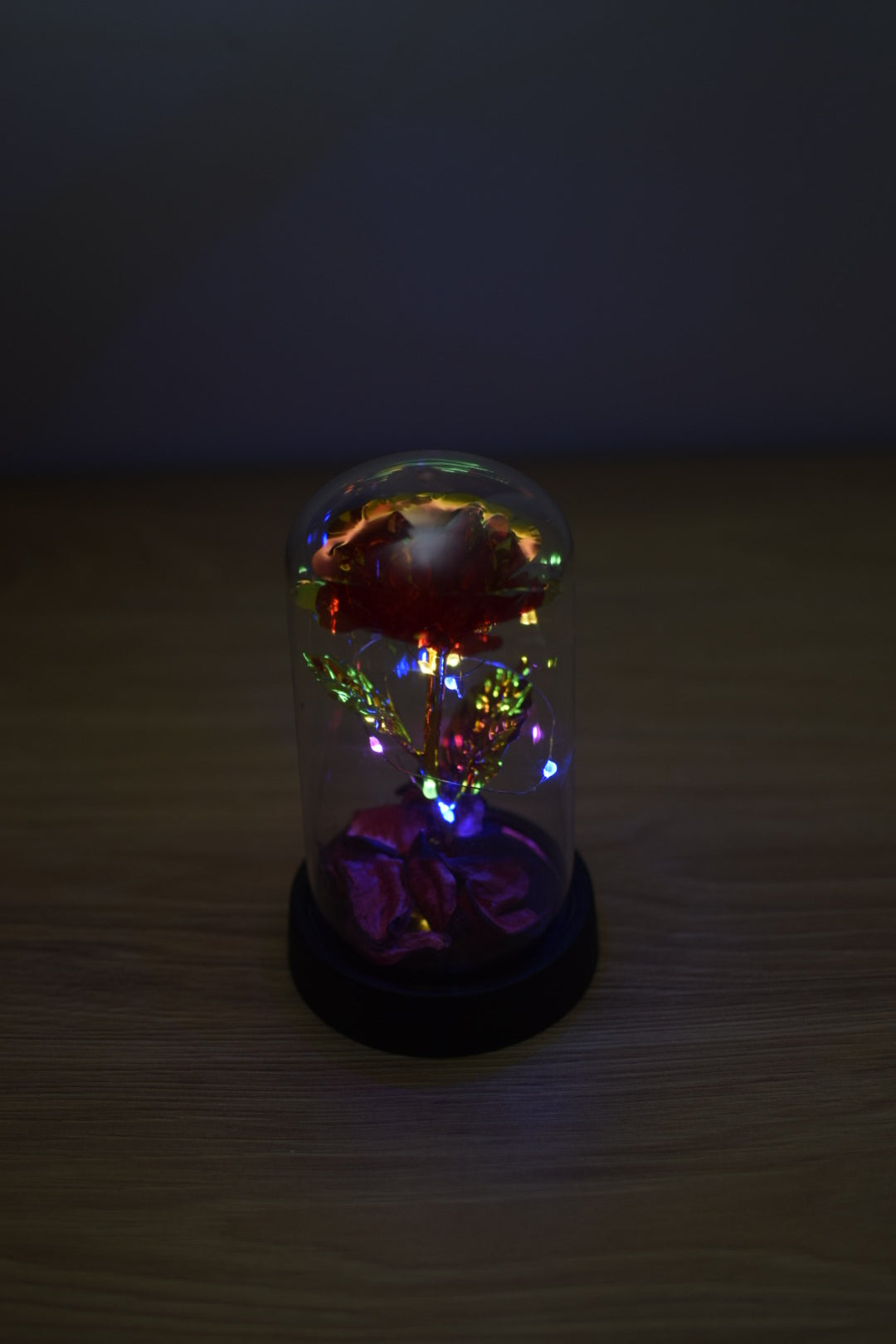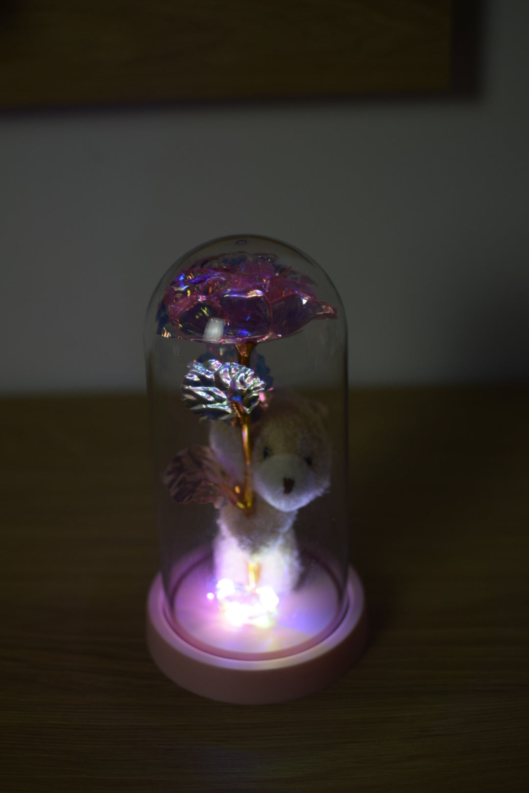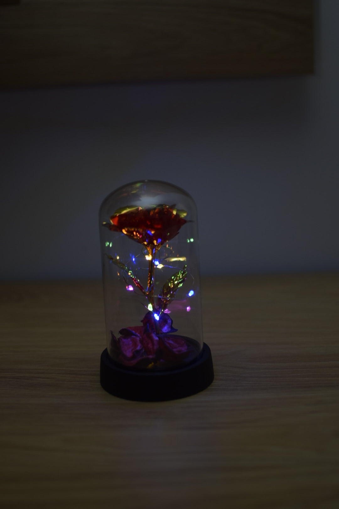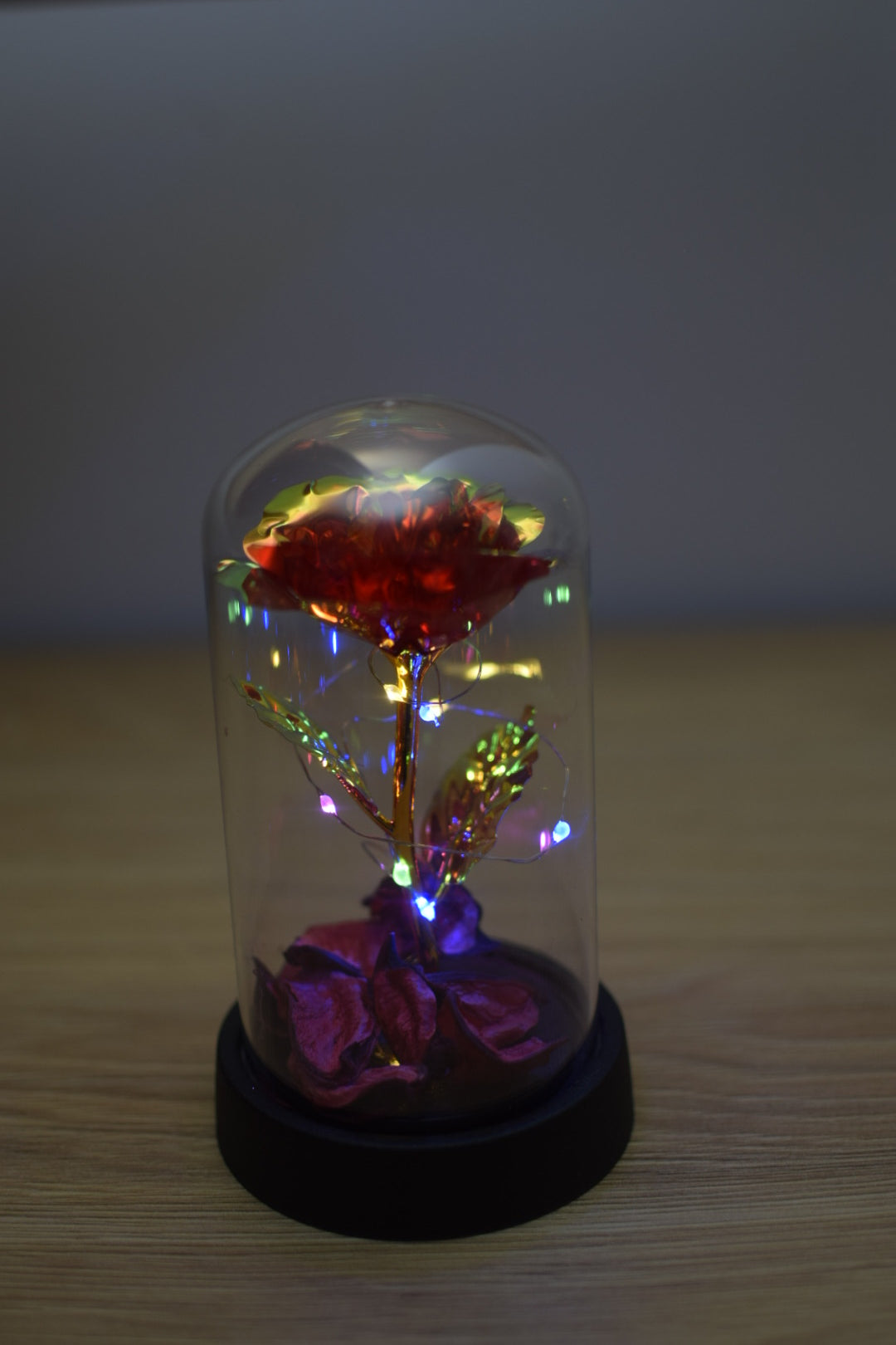 Trandafirul premium în cupolă, cu LED-uri integrate, creează un efect vizual elegant și cald, perfect pentru orice cameră. Lumina pune în valoare trandafirul și transformă cupola într-un decor special, care atrage imediat privirea.